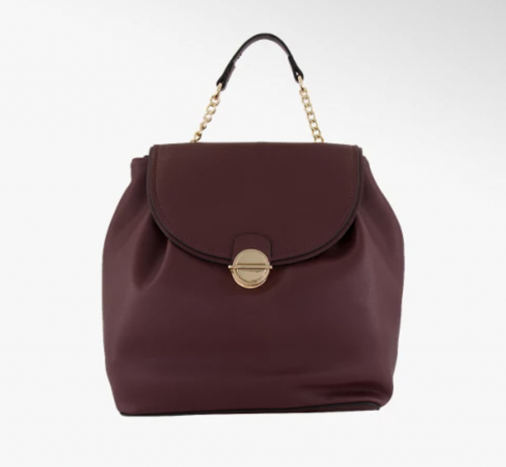 Der bordeauxrote Rucksack von L.CREDI ist aus hochwertigem Lederimitat mit goldfarbenen Metallelementen.