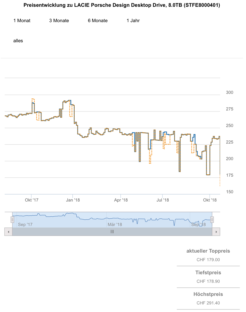 Gemäss toppreise lag der best price bislang bei 178.90 CHF, der zweitbeste Preis sind aktuell 237.- CHF.