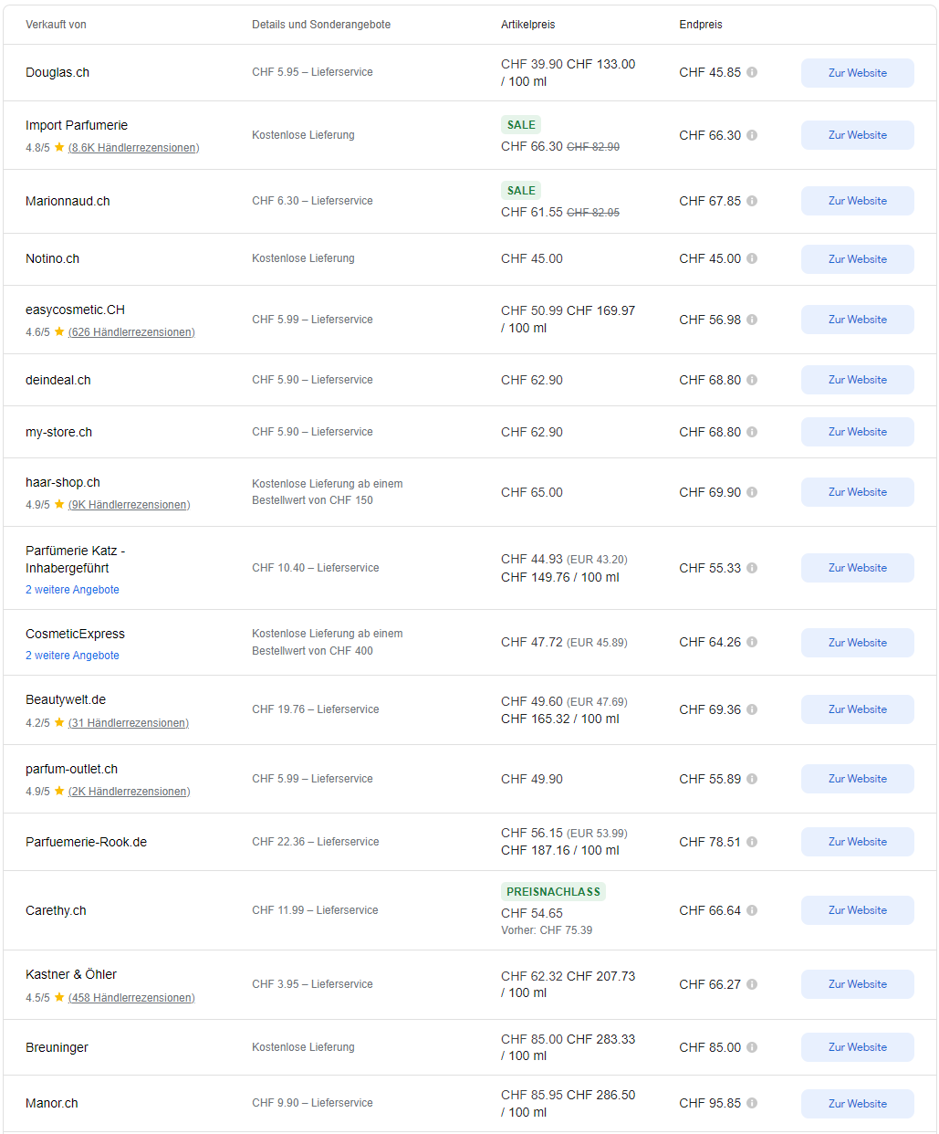 Bei Douglas gibt’s derzeit im Rahmen des 30%-Ausverkaufs das Eau de Parfum La vie est belle von Lancôme als Intensément Version zum Aktionspreis von 39.90 Franken inkl. gratis Lieferung. Laut Google Shopping sollte dabei notino mit 45 Franken der zweitgünstigste Anbieter sein.