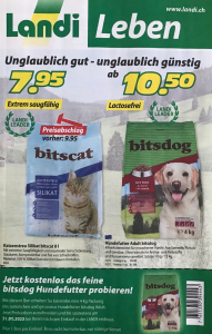 Alle Jahre wieder: im aktuellen Landi Prospekt (gültig ab 09.01.2023) gibt es wieder einmal einen Probier-Bon für eine 4 kg Packung Hundefutter bitsdog Adult mit Rind.