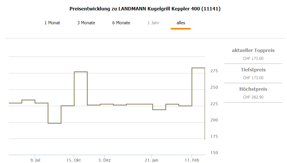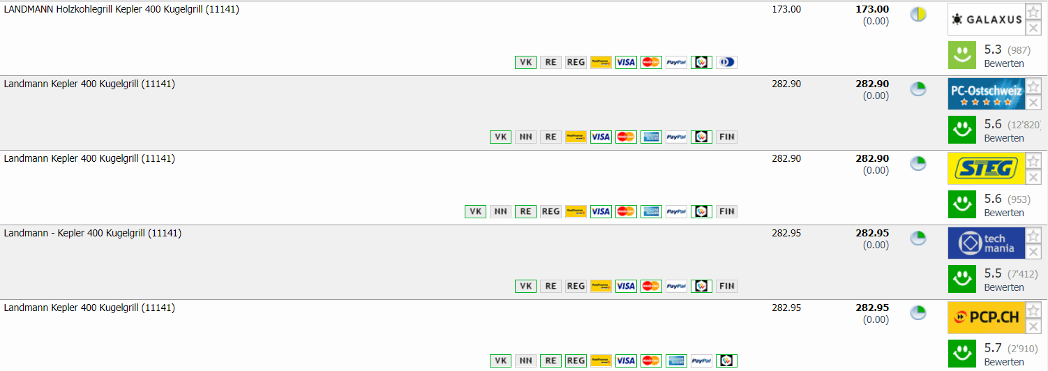 Bei Galaxus erhält man gerade den LANDMANN Kepler 400 Kugelgrill für CHF 173.- Zweitbester Preis beträgt im Moment CHF 282.90, bisheriger Bestpreis war CHF 198.05