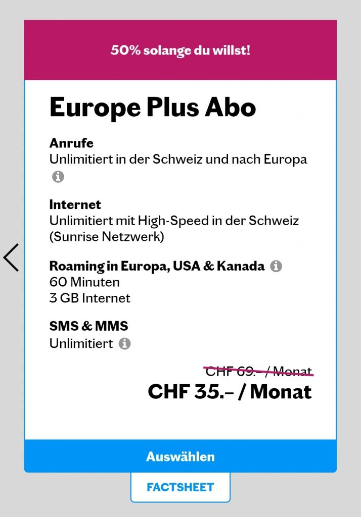 Momentan gibt es das Abo Lebara Europe Plus zum halben Preis. Dieses Abo ist eher selten Aktion. Lebara ist auf dem Sunrise Netz. Rabatt gilt für immer.