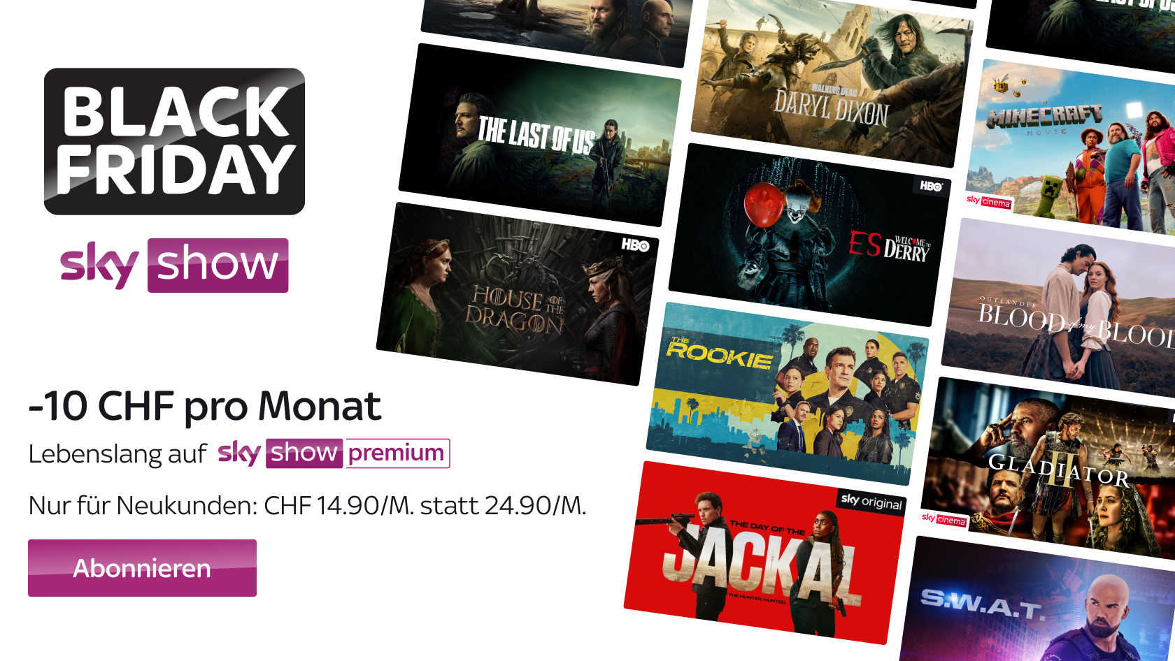 Lebenslang CHF 10 Rabatt auf Sky Show Premium (14.90 statt 24.90/M) – nur für neue Abos vom 24.11. bis 1.12. Solange du dein Abo behältst!
