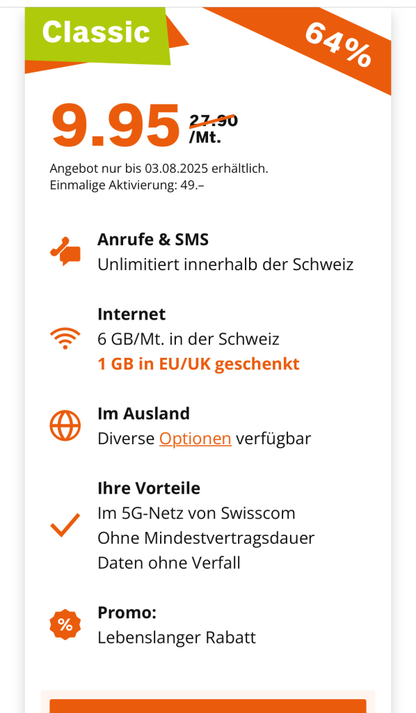 Coop Mobile mit lebenslangem Rabatt für 9.95 und 5G im Swisscom Netz.