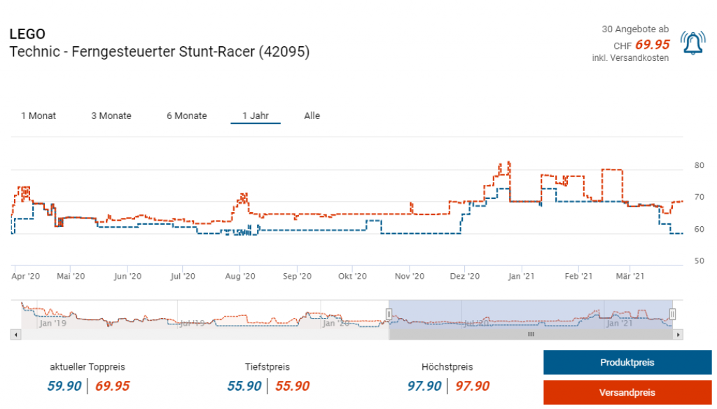 Bei Amazon gibts derzeit den Stunt-Racer LEGO Technic 42095 mit Fernsteuerung zum neuen Bestpreis von knapp 50 Franken inkl. Lieferung in die Schweiz. Laut toppreise starten die Preise in der Schweiz bei fast 70 Franken.