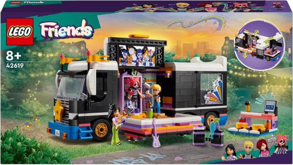 Mit dem LEGO Friends Popstar Tourbus können Kinder ab 8 Jahren ihrer Fantasie freien Lauf lassen. Dieses Musikspielzeug beinhaltet einen aufbaubaren Truck, einen Backstage-Bereich mit Zubehör sowie 4 LEGO Friends Figuren für spannende Rollenspiele. Dein Kind kann erleben, wie die schüchterne Paisley sich in die Superstar Ley-La verwandelt, indem es einfach den Spiegel dreht. Der Bus lässt sich vorne, seitlich und hinten öffnen, um den Backstage-Bereich mit Aufnahmeecke, Keyboard, Gitarre, Betten und Toilette zu entdecken. Dieses Set fördert die soziale und emotionale Entwicklung und ist ein tolles Geschenk für junge Musikfans.
