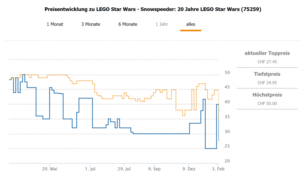 Zweitbester Preis beträgt CHF 44.70 Ohne Versand war der Snowspeeder bereits für CHF 24.95 erhältlich, mit Versand bisher nicht unter CHF 36.05