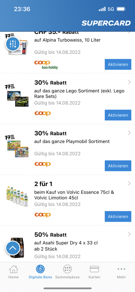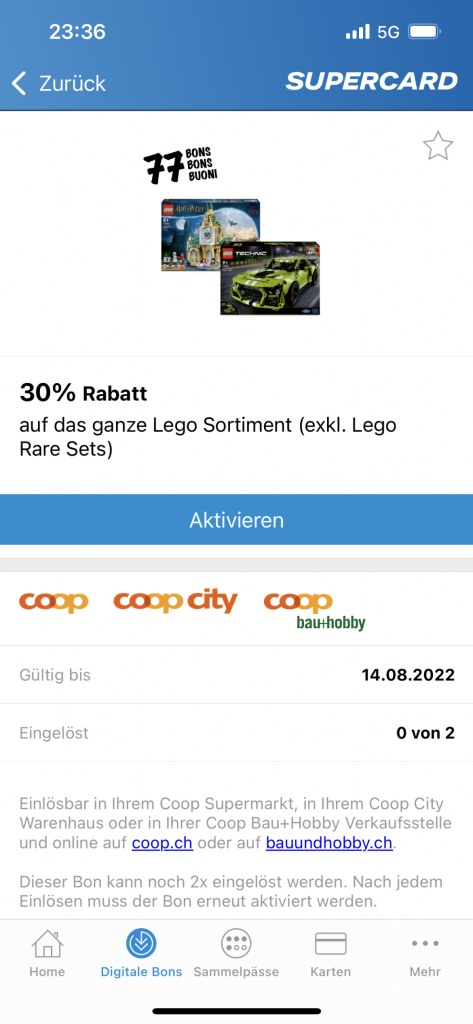 Bei Coop Bau+Hobby scheint der Daytona nicht als Rare Set zu gelten und somit von der 10% Rabattaktion zu profitieren. Obendrauf gibt’s in der Supercard App einen 30% Gutschein. Diesen müsst ihr aktivieren und danach mit den gleichen Daten eingeloggt bei B+H einkaufen.