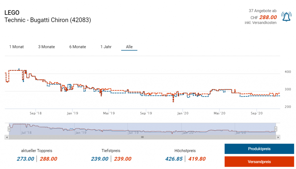 Bei amazon.co.uk gibts derzeit den Bugatti Chiron als Lego Technic Modell zum neuen Bestpreis von 212 Franken. Laut toppreise lag dieser in der Vergangenheit bei 239 Franken (den Preisfehler von damals für 60 Franken zähle ich nicht dazu 😉 ).