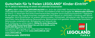 Wählt unter www.LEGOLAND.de/LEGO aus, ob ihr das LEGOLAND® Deutschland Resort oder das LEGOLAND Billund Resort (DK) besuchen möchtet. Anschließend erhält nach Eingabe des Aktionscodes 25010102 ein Kind (2–11 Jahre) beim Kauf eines Erwachsenentickets (regulärer Vorort-Preis) eine kostenlose 1-Tageskarte für den gleichen Tag. Original-Gutschein unaufgefordert beim Besuch im LEGOLAND in Günzburg oder Billund abgegeben.