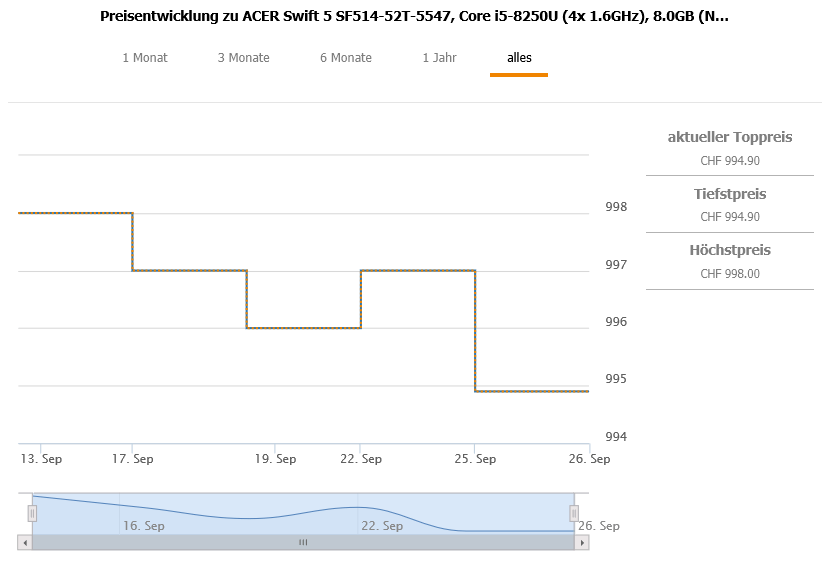 Gemäss toppreise gab es das Notebook bislang nie günstiger als für 994.90 CHF, was zugleich aktuell auch der zweitbeste Preis ist.
