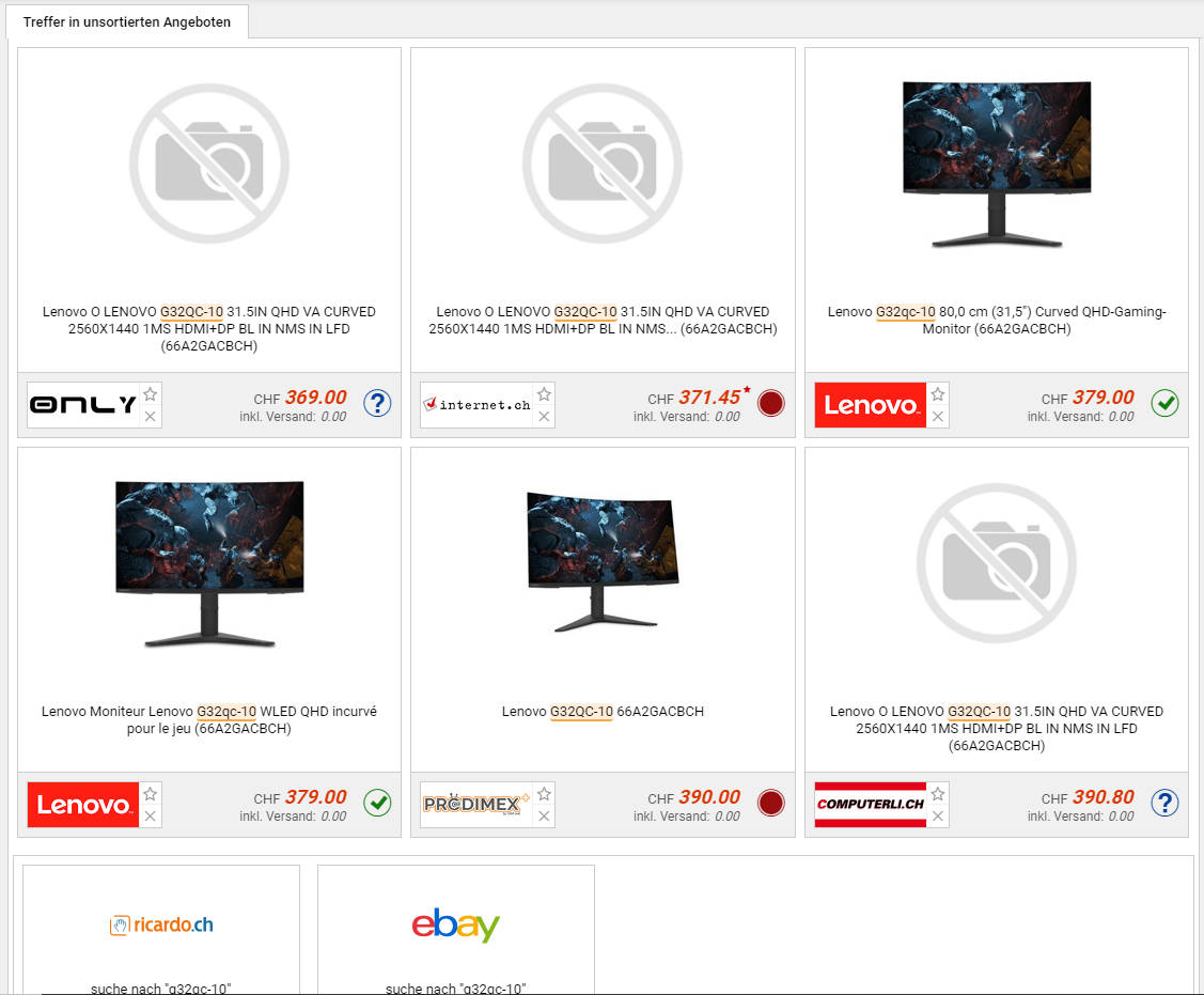 Bei amazon.co.uk gibts den Curved Gaming-Monitor G32QC-10 von Lenovo mit 144Hz Refreshrate und WQHD-Auflösung zum Aktionspreis von knapp 323 Franken. Laut toppreise soll der Vergleichspreis bei CHF 369.- liegen. Zurzeit gibts im Lenovo Store zwar 20% Rabatt auf alles und den Bildschirm somit theoretisch für knapp 303 Franken, allerdings ist er wohl immer noch nicht an Lager verfügbar (zum Warenkorb kommt dann eine Verfügbarkeitsmeldung).