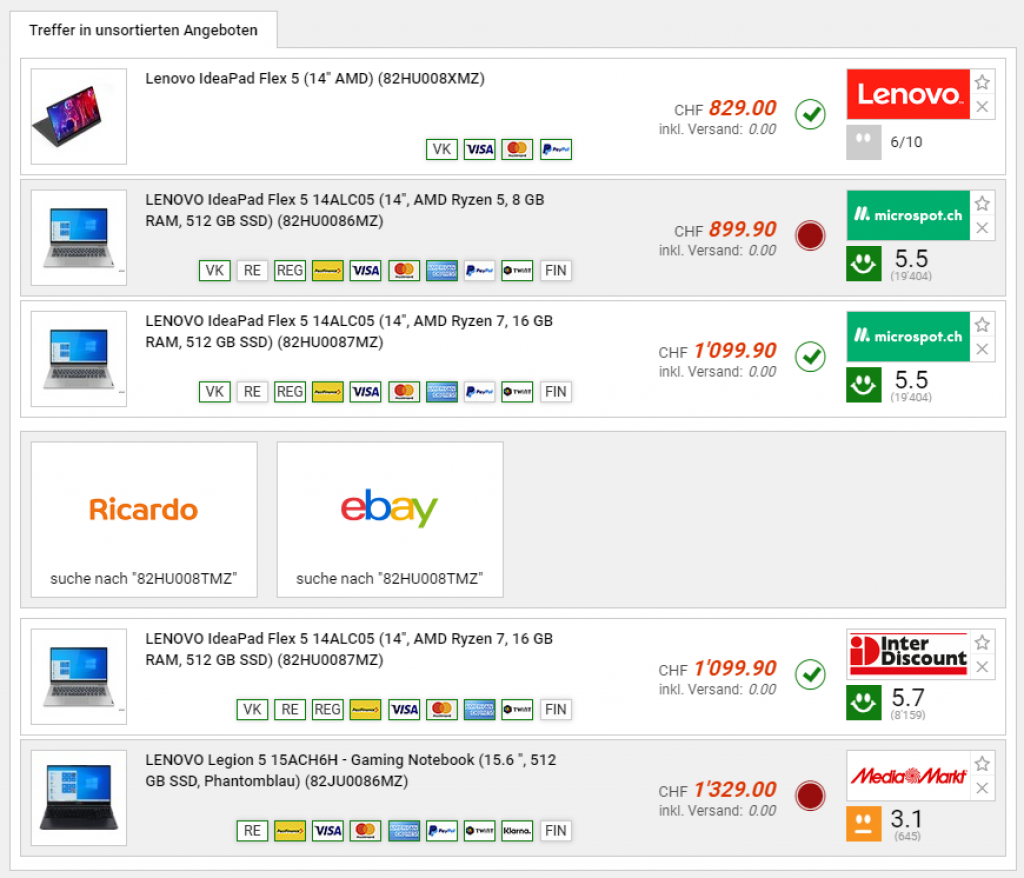 Den Vergleichspreis zu eruieren erweist sich indessen wieder mal etwas schwieriger, laut toppreise soll aber Lenovo mit 829 Franken der zweitgünstigste Anbieter sein.