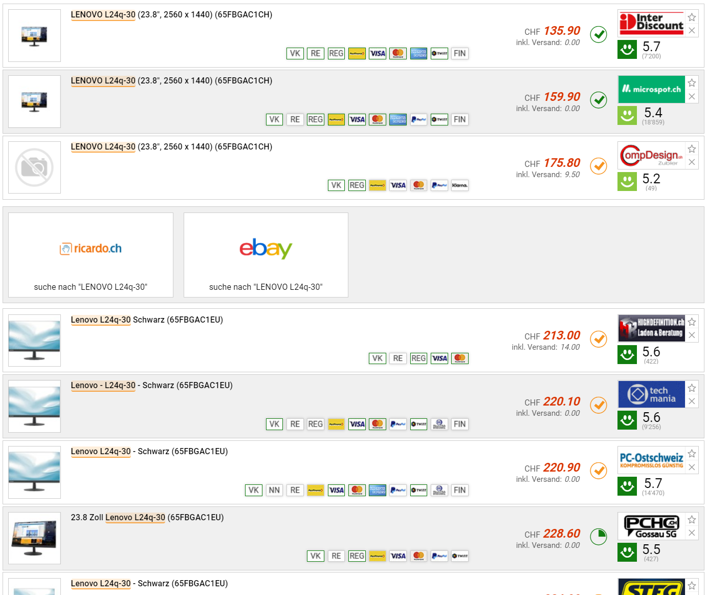 Bei Interdiscount gibt’s den LENOVO L24q-30 mit 75Hz für CHF 135.90 Zweitbester Preis beträgt CHF 159.90 Einen Preisverlauf gibt’s auf toppreise leider nicht.