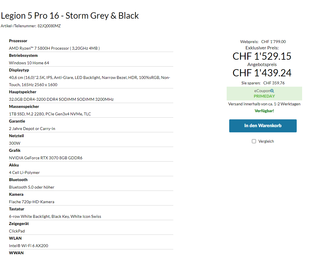 Das lang erwartete Legion 5 Pro im offiziellen Lenovo CH Store ist zurück. Versand in 1-2 Werktagen während ich noch auf die Bestellung vom 12. April warte….(sollte nächste Woche eintreffen 🤞) Es gibt nur ein Modell zur Auswahl, aber immer noch das begehrteste, würde ich sagen. Bei der Vorbestellung war der Preis besser aber dieser immer noch nicht schlecht