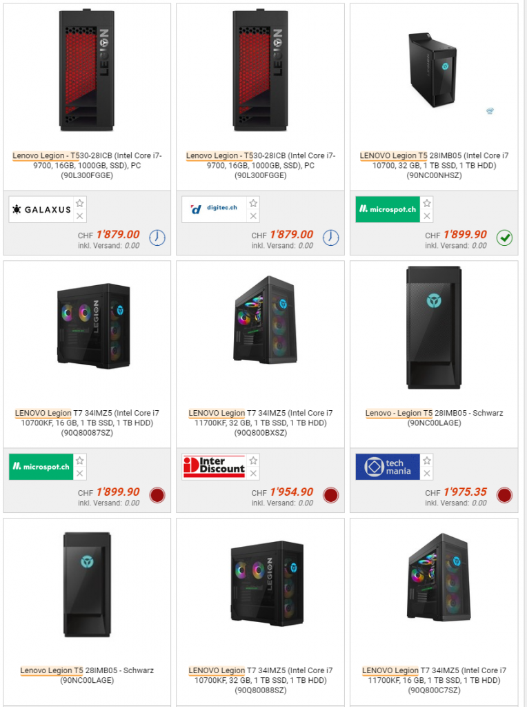Bei Interdiscount gibts bis zum 6.6. den Gaming-Desktop-PC Lenovo Legion T5 mit einer RTX 3070 Grafikkarte zum ‚erschwinglichen‘ Preis von unter 1600 Franken, das gibts sonst selten für einen Komplett-PC dieser Klasse. Der Vergleichspreis liegt bei knapp 1900 Franken bei microspot.