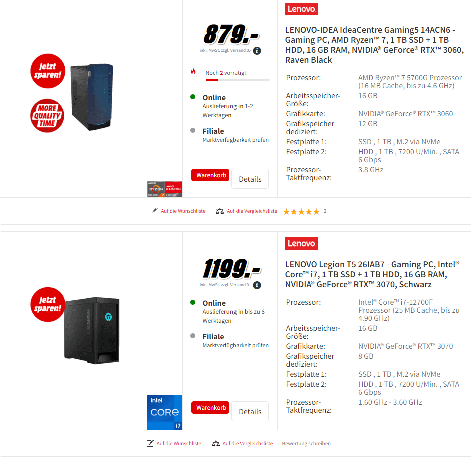 Lenovo Spartage bei MediaMarkt - Gaming-PCs mit RTX 3060 und 3070 Grafikkarten zu Sonderpreisen