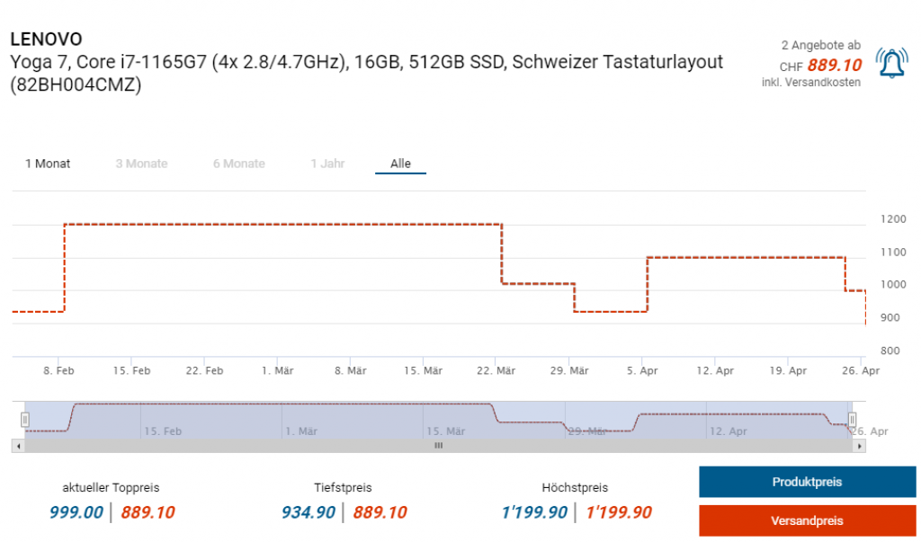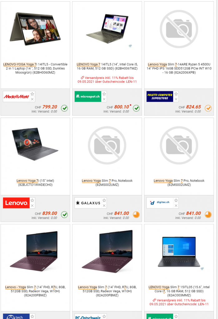 Bei Mediamarkt und microspot gibts derzeit das hochwertige Convertible Lenovo Yoga 7 im 14-Zoll-Format zu Aktionspreisen von jeweils CHF 799.20 resp. CHF 889.10. Laut toppreise soll der Vergleichspreis bei CHF 1099.90 liegen. Der Vergeichspreis für die 8GB-RAM-Variante wäre dabei das Angebot der 16GB-RAM-Variante, da besser + am günstigsten (auch 8GB-Modelle).