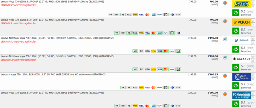 Bei STEG gibt’s gerade das Lenovo Yoga 730-13IWL 81JR-002P, mit 13.3″ Display, i5U Prozessor, FHD Auflösung, 16GB RAM und 256GB SSD Speicherplatz für CHF 799.- Den zweitbesten Preis bietet digitec mit CHF 1199.- Laut toppreise war der Bestpreis bei CHF 999.-