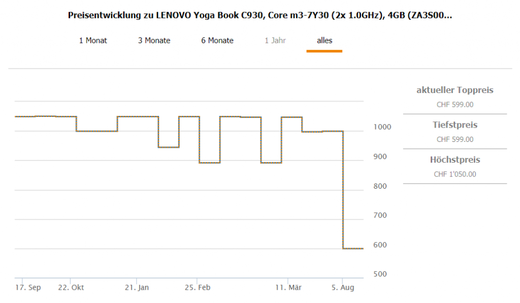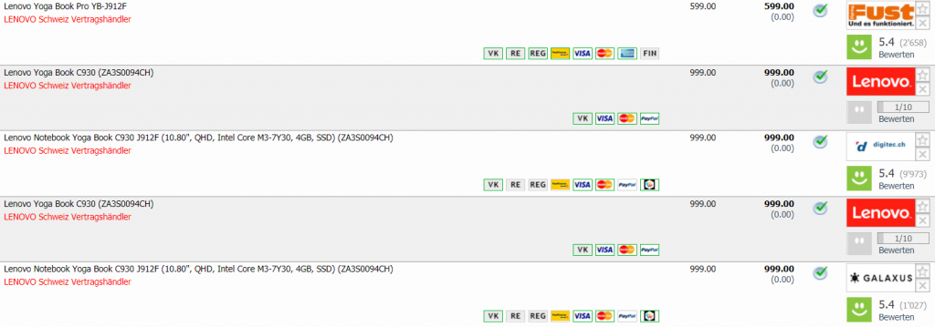 Bei Fust gibt’s gerade das Lenovo Yoga Book Pro YB-J912F für CHF 599.- Mit Gutscheincode 1119RM sogar für CHF 579.- Zweitbester Preis derzeit liegt bei CHF 999.- Bestpreis bisher ist CHF 891.65.