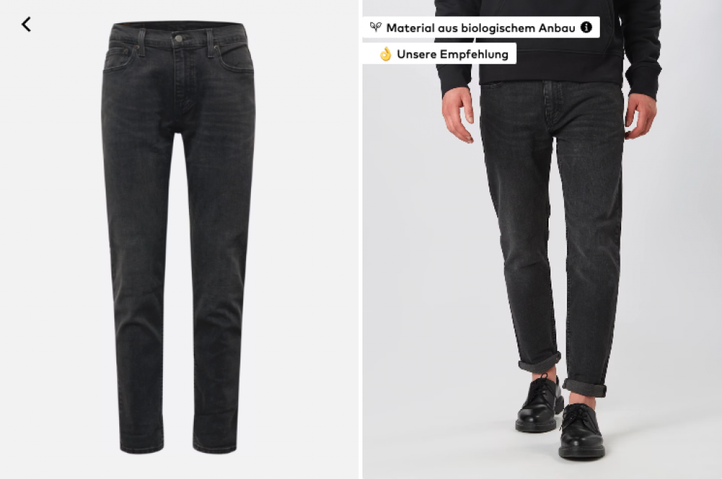 Für CHF 54.70 gibt es die schwarze Jeans mit Waschungseffekt mit Baumwolle aus biologischem Anbau. Es sind noch viele Grössen von 26×30 bis 36×30 verfügbar.