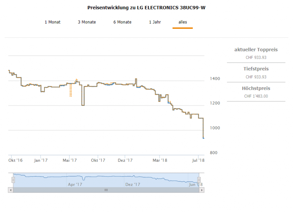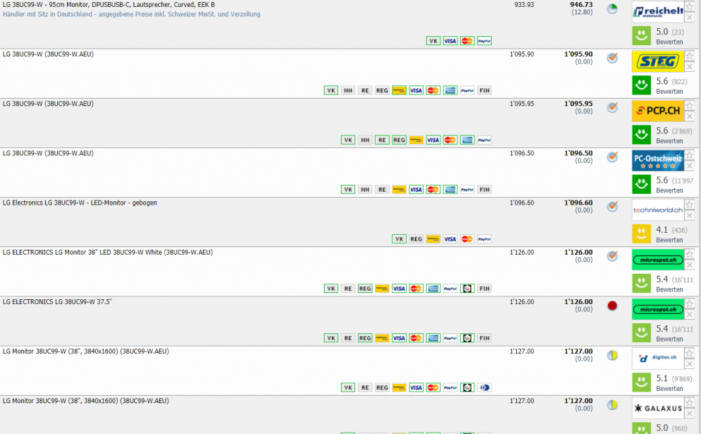 Bei reichelt gibt’s gerade den LG 38” Curved Monitor 38UC99-W für CHF 934.- dazu kommen noch Versandkosten, was zu einem Preis von CHF 946.75 führt. Es handelt sich dabei um einen Händler mit Sitz in Deutschland, die Verzollung ist bereits im Preis bereits inbegriffen. Der Versand kann natürlich etwas länger dauern.. Die Bewertungen des Shops auf toppreise sind recht gut. Der beste Preis in der Schweiz liegt bei CHF 1’095.90 was gleichzeitig der bisherige Bestpreis war.