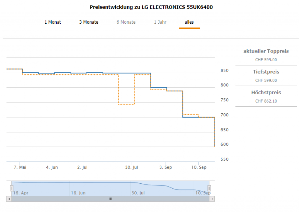 Der 55 Zoll TV mit Energieklasse A+ kriegst du aktuell für 599 CHF. Der nächst günstigere Preis wäre 699 CHF was gleichzeitig auch der beste jemals gemessene Preis bis jetzt war.