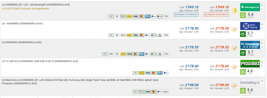 Bei Microspot gibt es momentan den LG 65SM9800 für den neuen Bestpreis von CHF 1539.10. Der vorherige Bestpreis und auch zweitbeste Preis beträgt CHF 2178.50.
