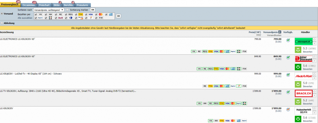Der Rabatt sieht jetzt nicht so wahnsinnig Toll aus, weil der zweitbeste Preis 849 CHF ist. Das ist aber nur so, weil InterDiscount ebenfalls dieses Gerät in einer Mega Aktion bewirbt und 15 % auf den normalen Preis gibt. Der Drittbeste Preis wäre dann 999 CHF! Aus meiner Sicht ein tolles Schnäppchen für die Fussball WM.