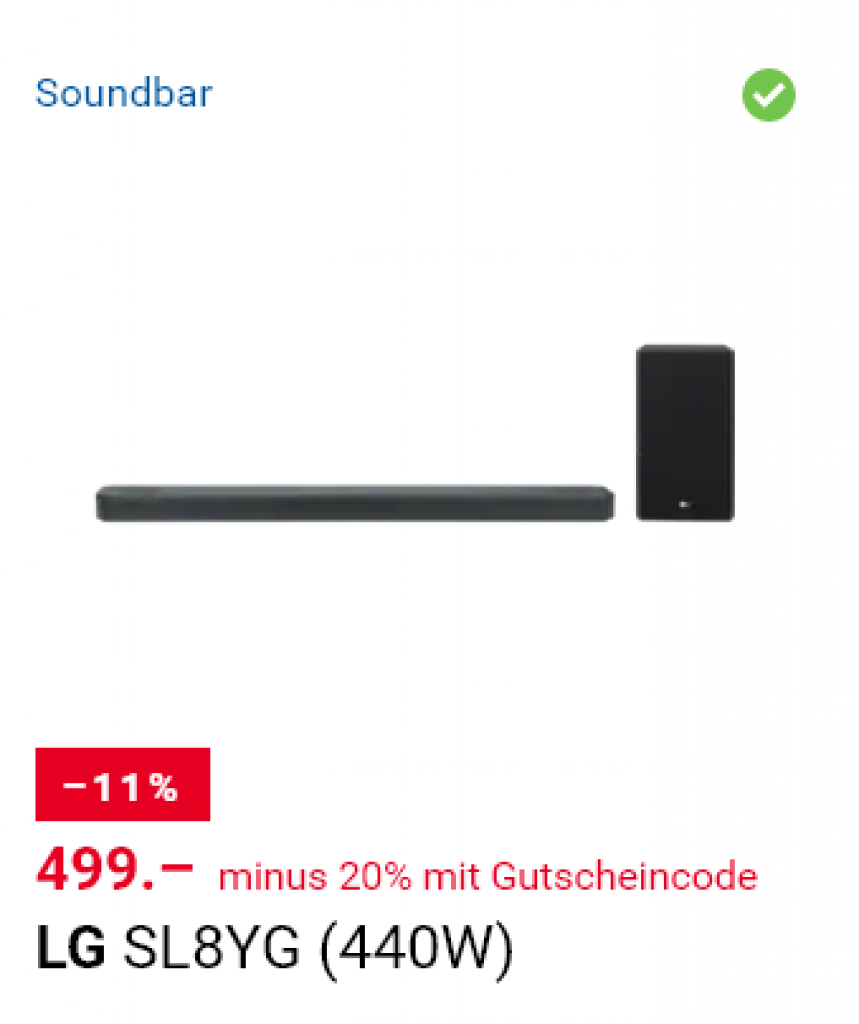 LG verkauft die SL8YG mit dem Gutscheincode «SOUND20» für 399.-. Die Soundbar kann Dolby Atmos und hat den Google Assistant integriert.