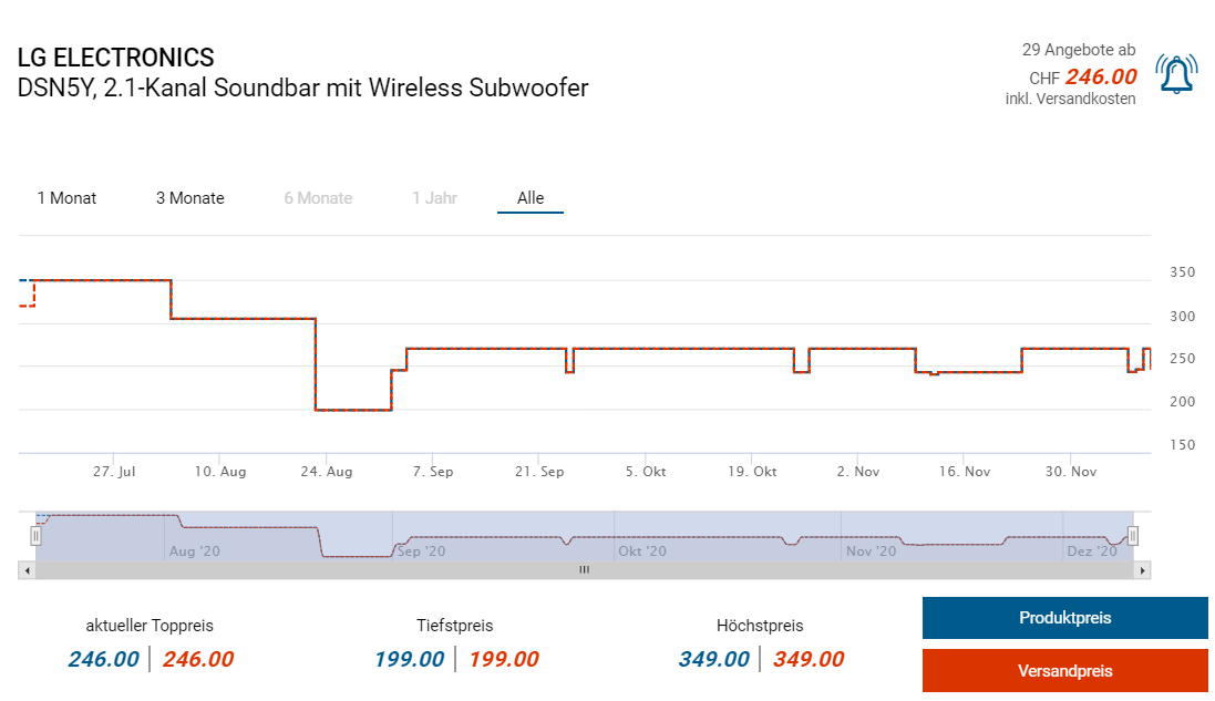 Bei microspot gibts derzeit die Soundbar DSN5Y von LG zum Preis von 246 Franken. Laut Preispirat-Recherche gabs die Soundbar aber schon mal in einem Lagerausverkauf bei digitec für 199 Franken zu kaufen.