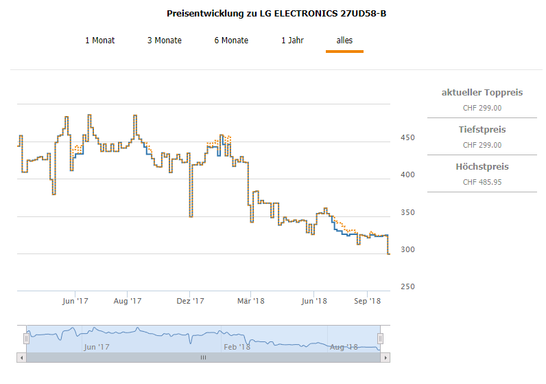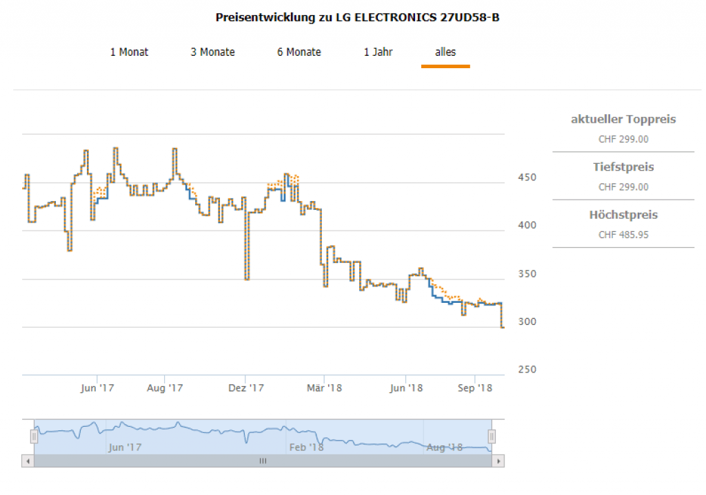 Bei Digitec gibt es heute 20 Bildschirme für 299 CHF der nächst günstigere Preis ist 323.35 CHF. Bis jetzt war 323.35 der beste jemals gemessene Preis in der Schweiz. Der Preisverlauf dieses Gerätes ist sehr Interessant, in letzter Zeit ist er immer bei rund 330 CHF rumgeschwirrt und jetzt nochmals 30 CHF günstiger geworden.