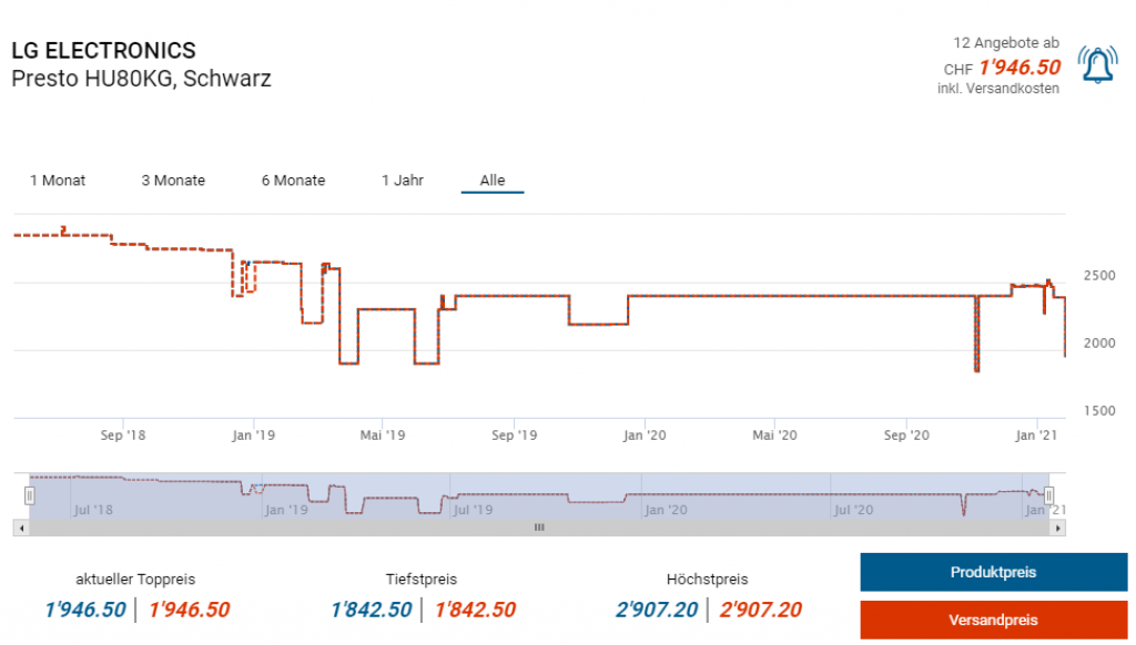 Bei Amazon gibts derzeit den Laserbeamer HU80KG von LG mit angeblicher 4K-Resolution (sehr wahrscheinlich durch Up-Scaling) und HDR10-Unterstützung zum neuen Bestpreis von knapp 1421 Franken. Laut toppreise gabs den Beamer nie günstiger als für 1842 Franken. Wenn ich mich jedoch recht erinnere gabs am Black Friday ein ähnlich gutes Angebot bei Amazon. Beachtet jedoch, dass kein Liefertermin angegeben ist und ihr mit mind. 2 Wochen rechnen solltet.