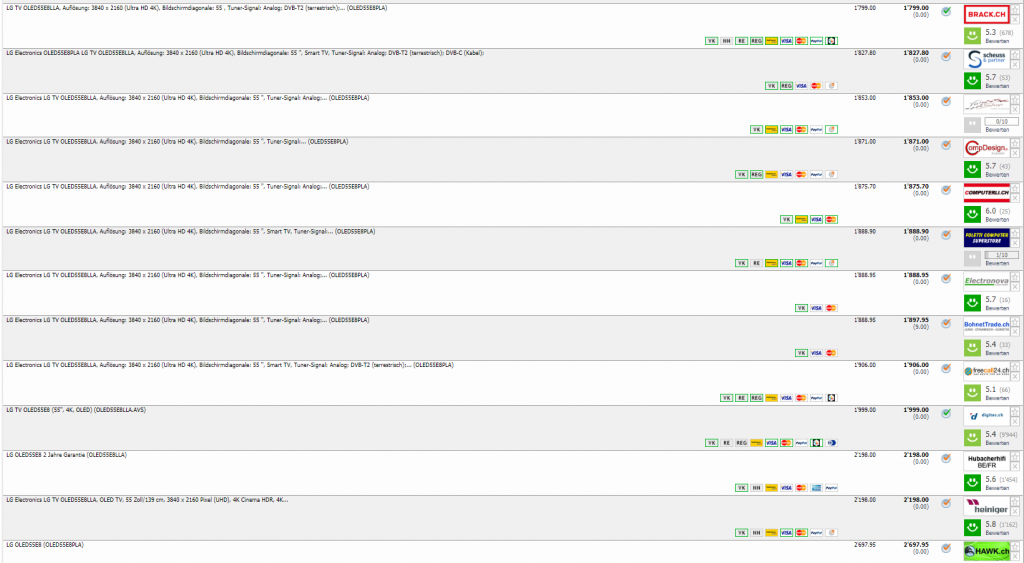Bei DeinDeal gibt’s gerade den LG OLED55E8 für CHF 1’333.- Zudem werden CHF 9.- für den Versand fällig. Zweitbester Preis in der Schweiz liegt bei CHF 1’677.90 Das ist laut toppreise ebenfalls der Bestpreis. Das ist insofern erstaunlich, dass praktisch alle Elektronik-Händler den TV im Sortiment haben. Brack will für den TV beispielsweise CHF 1799, digitec sogar CHF 1999.-
