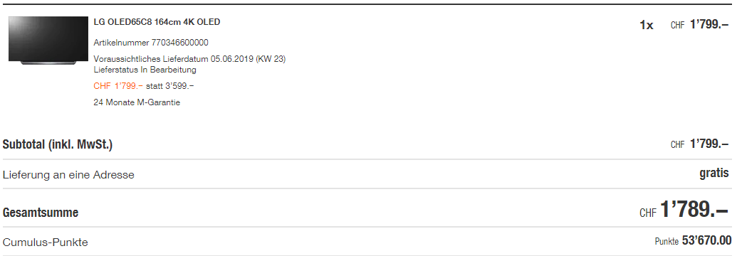 Wer noch einen 10-fach Cumulus-Coupon hat, kann noch mehr sparen und kommt dann auf umgerechnet 1252.30 CHF, was ein Knallerpreis für den TV ist!