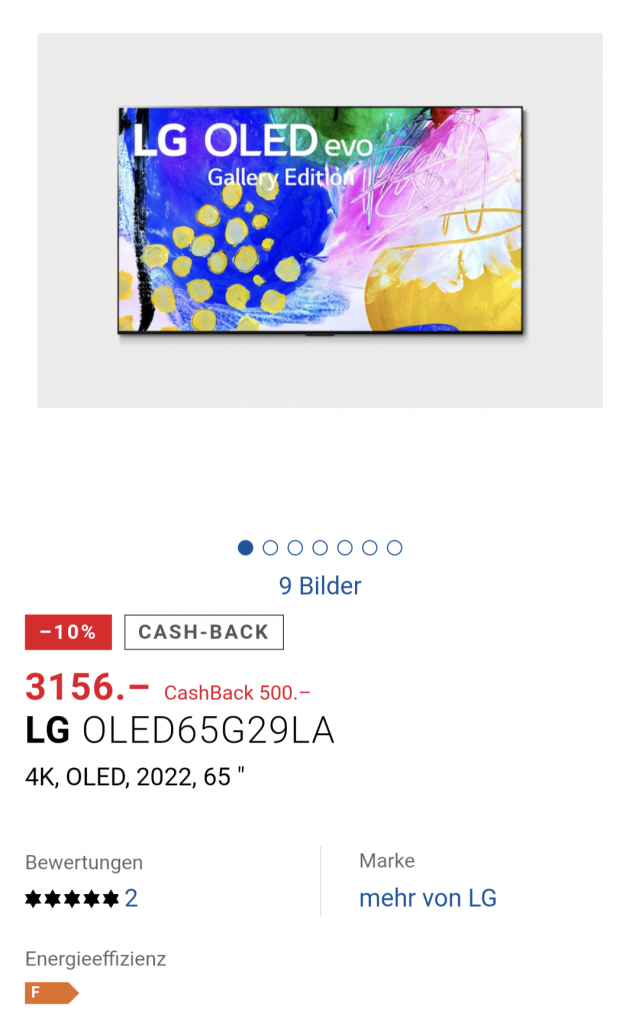 Im Aktionszeitraum vom 23.10.22 bis einschliesslich 5.12.22 erhältst du beim Kauf vom OLED65G2 CHF 500.- Cashback.