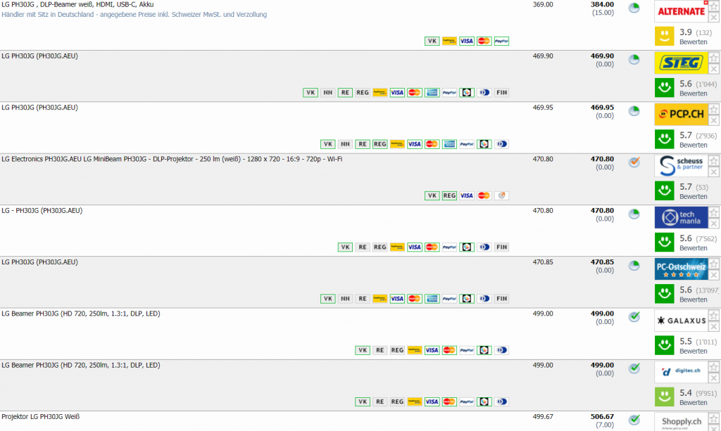 Bei Alternate gibt’s den Mini-Beamer LG PH30JG für CHF 384.- inkl. Verzollung und Lieferung in die Schweiz. In der Schweiz kostet das Gerät ab CHF 469.90 Bestpreis bis jetzt war bei CHF 399.90