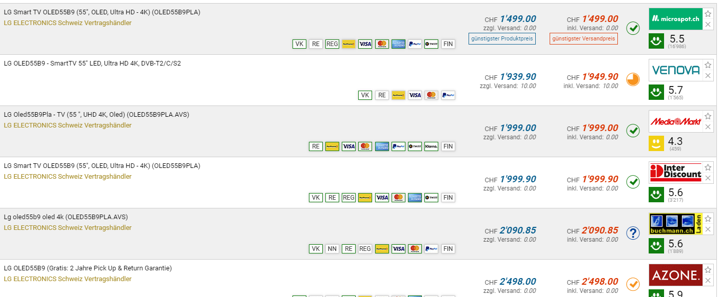Den LG Smart TV OLED55B9 Fernseher gibt es bei Microspot für den neuen Bestpreis von CHF 1499.–. Der vorherige Bestpreis lag bei CHF 1799.–. Der zweitbeste Preis liegt bei CHF 1949.90.