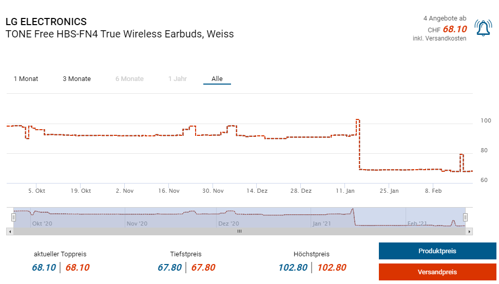 Bei Amazon gibts derzeit die True Wireless Kopfhörer HBS-FN4 von LG zum Aktionspreis von knapp 50 Franken. Der Bestpreis lag allerdings schon bei knapp 41 Franken vor 3 Wochen in diesem Deal hier.