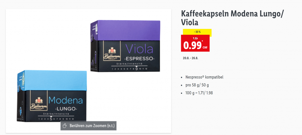 Ab heute bis zum 26. August, gibt’s bei LIDL wieder die ganz günstigen Kaffeekapseln (Nespresso kompatibel) von Bellarom zum guten Preis von 99 Rappen pro 10er Pack (9.9 Rappen pro Kapsel). Vergangene Aktionen gab’s jeweils mit 10.9 Rappen pro Kapsel.