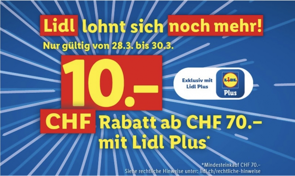 Lidl lohnt sich noch mehr! Nur von 28.3. bis 30.3.2024 CHF 10.-Sofortrabatt mit Lidl Plus! (Mindesteinkauf CHF 70.-).*