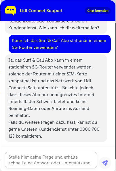 Der Lidl Connect Chatbot hat zudem bestätigt, dass man die SIM-Karte in einem Router betreiben kann. Vielleicht hat jemand Erfahrung damit und kann mehr dazu sagen.