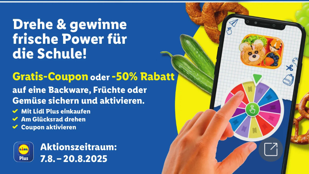 Wenn ihr euch die Lidl Plus App herunterladet, könnt ihr aktuell von einer Promotion profitieren, indem ihr das Rad dreht und Sofortpreise gewinnt. Dies gilt vom 7.8.–20.8.2025. Die Bons scheinen 7 Tage gültig zu sein.