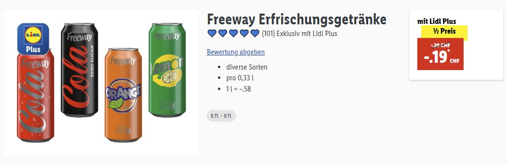 Am Freitag und Samstag (8. - 9.11.2024) gibt es die Dose Softdrink der Eigenmarke Freeway zum Preis von CHF 0.19.- pro Dose mit LIDL Plus, was einem Liter-Preis von CHF 0.58 entspricht.