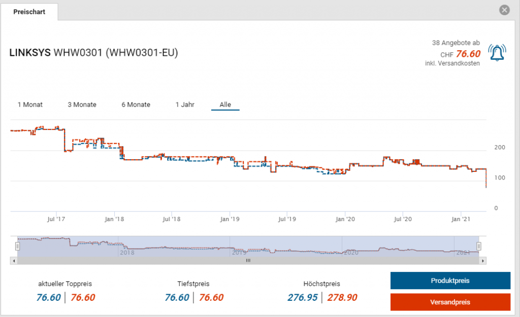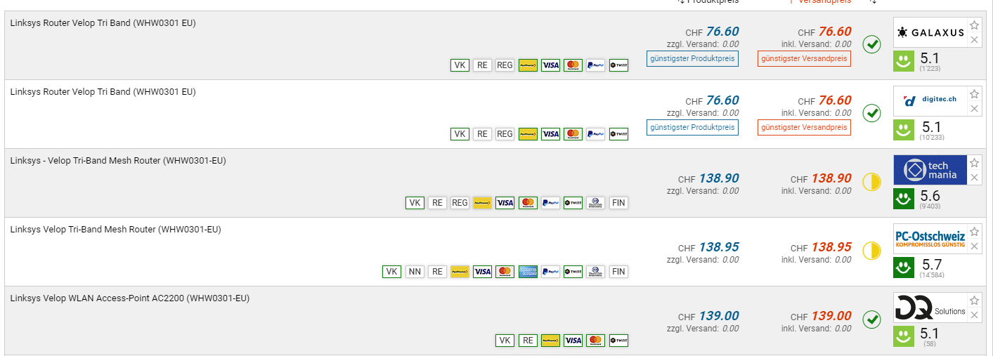 Bei galaxus und dem Partner digitec gibt es den Linksys Velop Tri Band Wifi Router für den neuen Bestpreis von CHF 76.60. Der vorherige Bestpreis war CHF 129.-. Der zweitbeste Preis beträgt CHF 138.90.