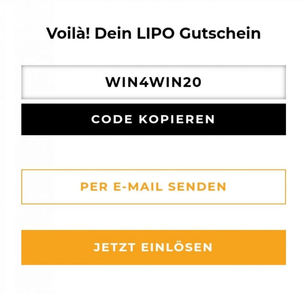 Dieser Gutschein ist gültig bis zum 23.10.2021 ab einem Mindesteinkauf von CHF 80.- in allen LIPO Filialen sowie dem Online Shop einlösbar. Barauszahlungen ausgeschlossen. Nicht kumulierbar mit weiteren Gutscheinen.