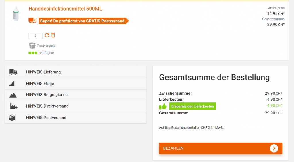 Bei LIPO kann man gerade 2x 500ml Handdesinfektionsmittel zum (aus meiner Sicht für den Moment) fairen Preis von je CHF 14.95 kaufen. Dazu kommt die Liefergebühr von CHF 4.90, wenn man nicht mindestens zwei Desinfektionsmittel bestellt oder nicht einen Füllartikel für mindestens CHF 5.05 einkauft.