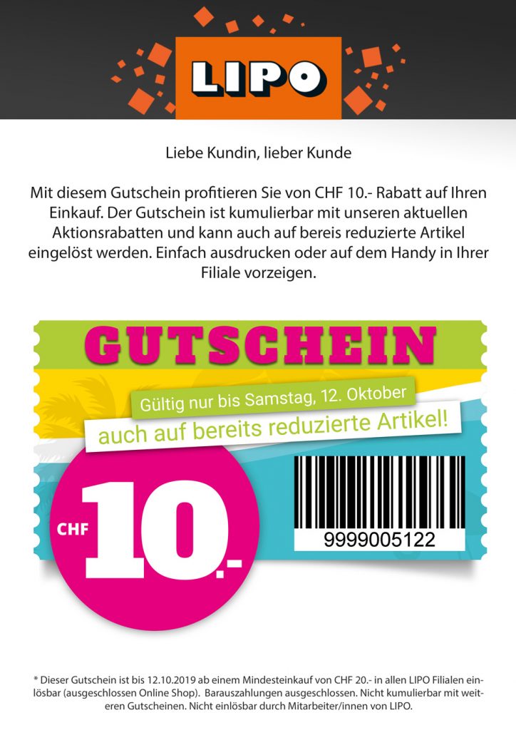 Bis am 12.10.2019 hat LIPO einen CHF 10.- Gutschein (ab CHF 20.- Einkauf). Leider ist der Onlineshop ausgeschlossen.