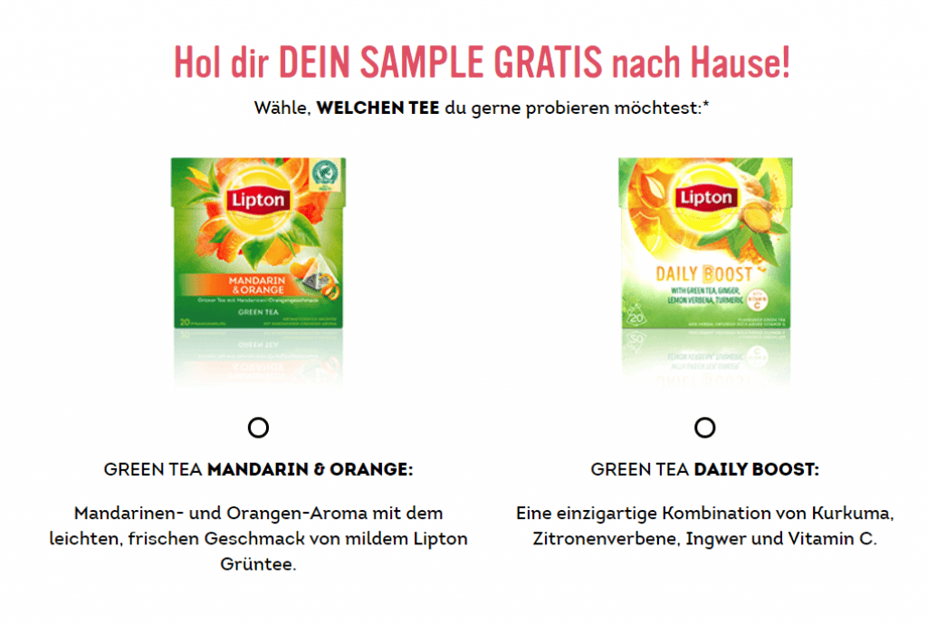 Bei Lipton kann man gerade zwei Tee-Sorten gratis ausprobieren. Man hat die Wahl zwischen Green Tea Mandarin & Orange oder Green Tea Daily Boost. Ich habe mich für den zweiten Tee entschieden.