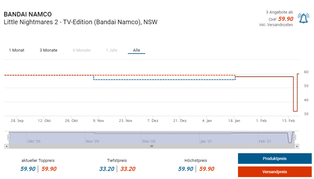 Bei Amazon gibts derzeit die Sammleredition von Little Nightmares 2 zum Aktionspreis von knapp 50 Franken. Laut toppreise läge der Vergleichspreis in der Schweiz bei fast 60 Franken. Scheinbar solls das Ding erst kürzlich für knapp 33 Franken gegeben haben, leider wurde dazu aber kein Deal eingereicht.